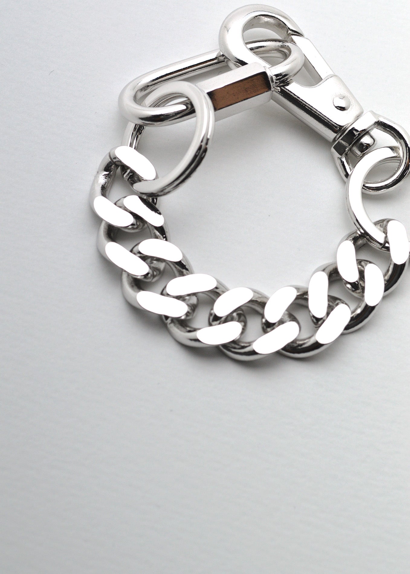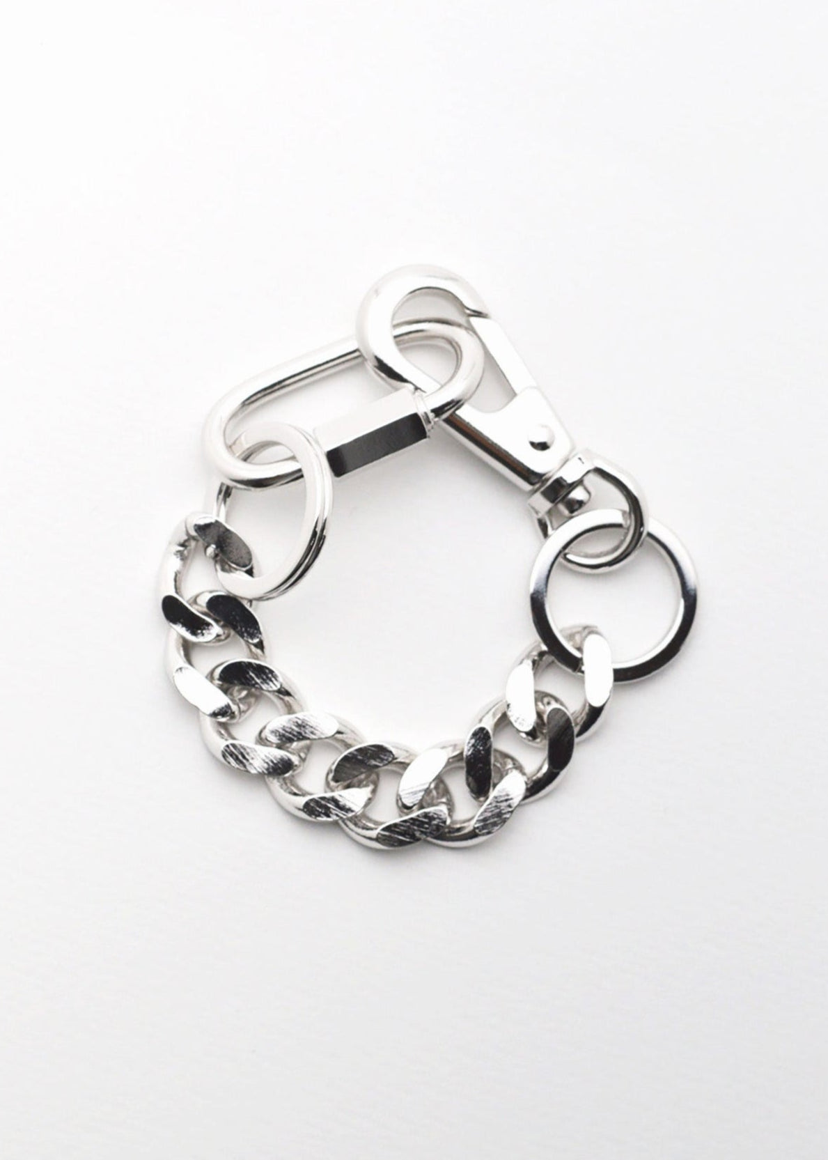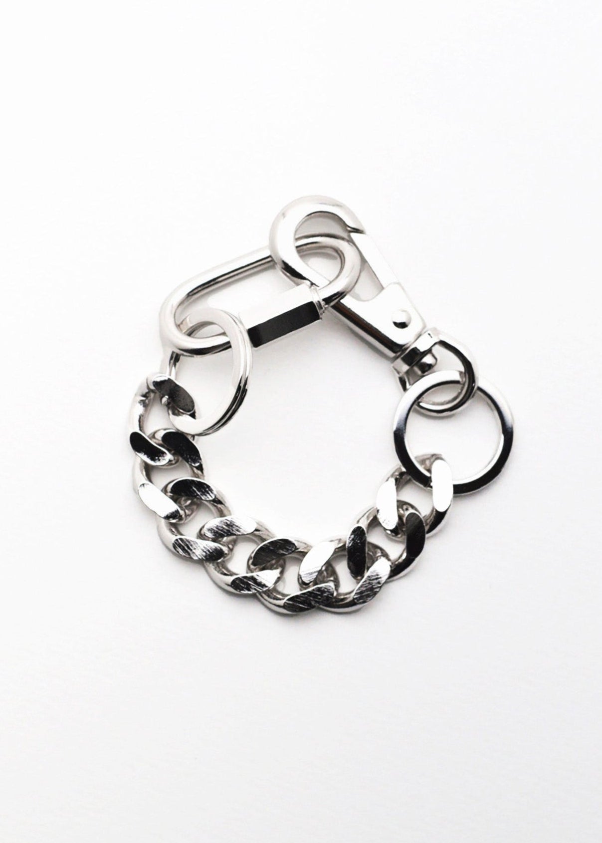ブランドのシグネチャーアイテムとなるシルバーキーチェーン。こちらはダブルカラビナのモデル。香港の街並みのような和洋折衷をイメージしたデザインで、存在感のある太めの喜平チェーンとカラビナのエンドパーツが特徴です。またブレスレットとして使用したり、バックにカラビナ部分をかけたりと、様々な使い方ができるアイテム。