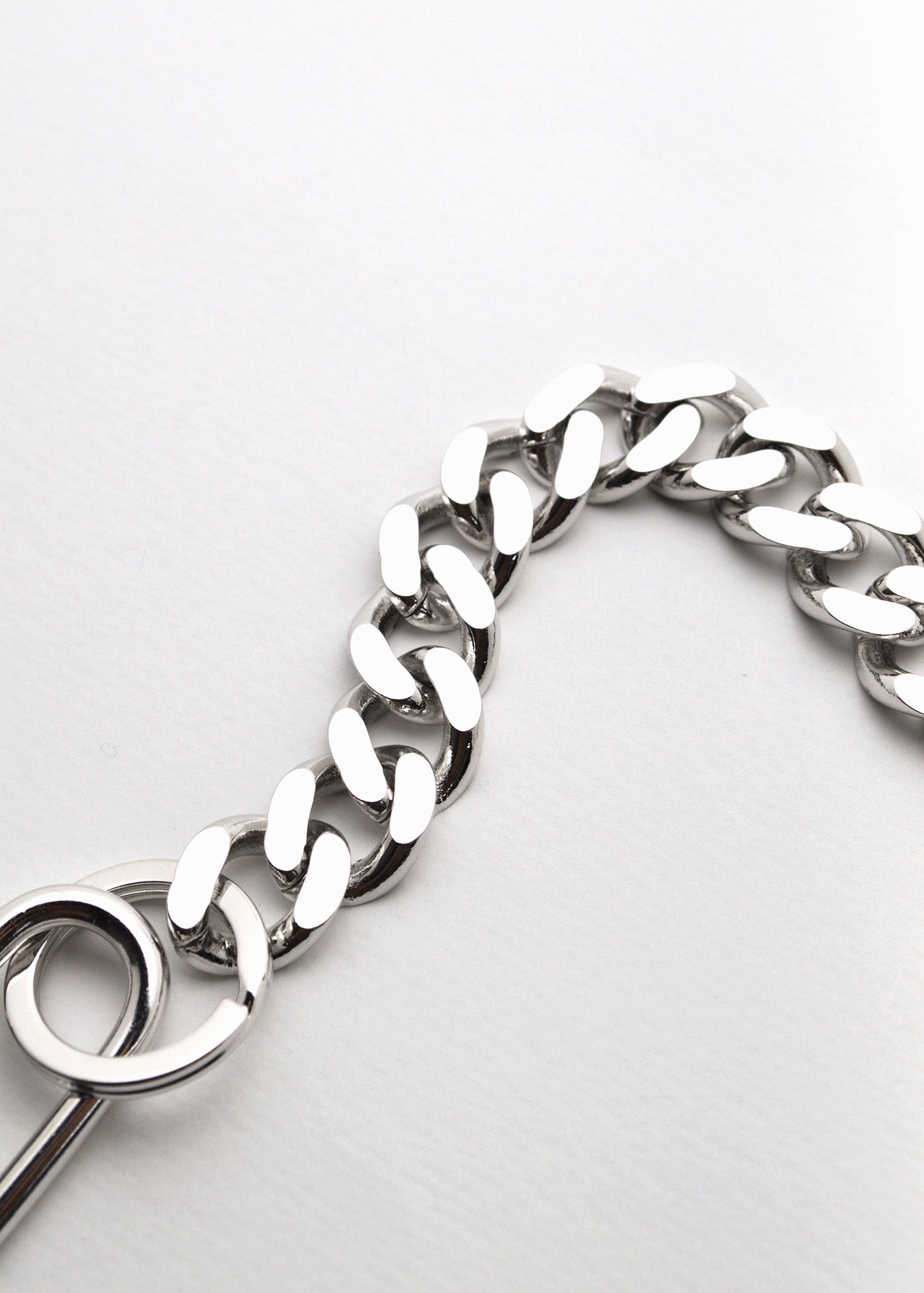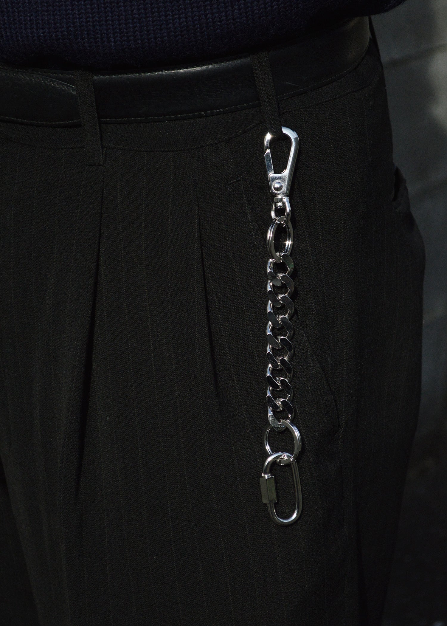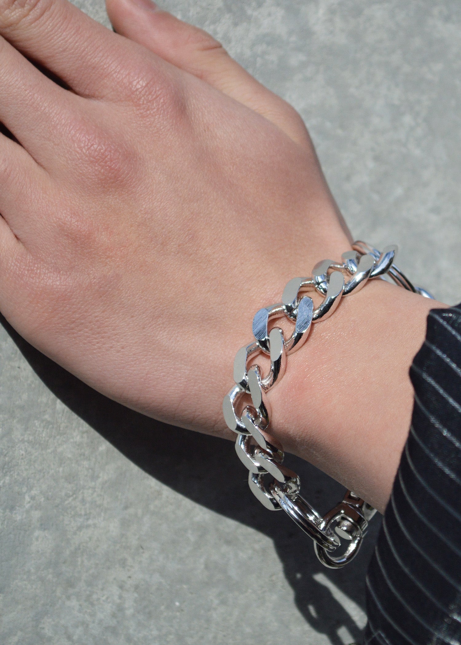 ブランドのシグネチャーアイテムとなるシルバーキーチェーン。こちらはダブルカラビナのモデル。香港の街並みのような和洋折衷をイメージしたデザインで、存在感のある太めの喜平チェーンとカラビナのエンドパーツが特徴です。またブレスレットとして使用したり、バックにカラビナ部分をかけたりと、様々な使い方ができるアイテム。